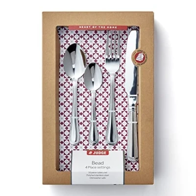 AmazonTABLEWARE GIFT SET FOR 4 PEOPLE - 4 table knives, 4 table forks, 4 dessert spoons and 4 tea spoons ELEGANT AND TRADITIONAL DESIGN - inspired by Hester Bateman's design from the 1700's, the Bead range is smart enough for entertaining yet simple enough for casual suppers - each piece is well balanced with a lovely feel in the hand and a tear-drop handle DURABLE, DISHWASHER SAFE CUTLERY - made in high quality 18/0 stainless steel for a sparkling high-shine finish and for extra strength to ensure the blades and fork tines stay true and do not bend or twist IDEAL GIFT - the cutlery set comes gift boxed, ready to wrap, as an ideal wedding gift, engagement present or housewarming gift to celebrate a new home 25 YEAR GUARANTEE by Judge Homewares. Judge has been trusted by families all over the world for its traditional family values, high performance products and award-winning customer service, Manufacturer: Horwood