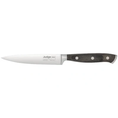 Introducing the Judge Pro 12cm Utility Knife, expertly crafted and versatile, promising to make your kitchen tasks easier.This knife is a compact kitchen essential known for its sharpness and control. Whether you're dicing, chopping, or slicing smaller ingredients, this knife delivers precise cuts with ease. The hard-wearing Pakkawood handle guarantees a secure grip and superior balance, enhancing your control during usage.It features a carbon stainless steel blade, renowned for its long-lasting performance. Part of the Judge Pro range, it fits perfectly into a professional or home kitchen setting. It's also easy to maintain, with the blade's sharp edge easy to sharpen.This product comes supplied with a manufacturer’s 25-year guarantee.Dishwasher safe.  Knives are not for sale to persons under the age of 18. - all knives and bladed products are delivered by Age Verified Delivery (AVD). The carrier may request proof of age in order to deliver your parcel. If proof of age is not available, or the recipient is underage, the carrier will refuse to deliver.
