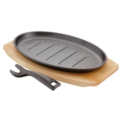 ManoManoGeneral description Judge Sizzle & Serve is a versatile cast iron platter designed for oven-to-table serving. It features a durable maple wood base that enhances its aesthetic appeal while providing stability. Technical specifications Material: Cast iron with a maple wood base Oven safe temperature: 240°C Weight: 1,605g External dimensions: Height: 4.0cm, Width: 18.0cm, Length: 31.0cm Compatibility and accessories Suitable for all hob types, including induction Ideal for use on BBQs
