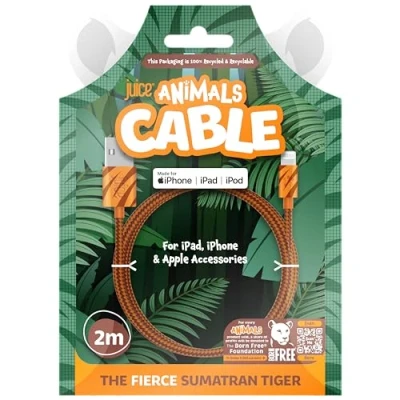 Juice Animals Apple iPhone Lightning 2 m Braided Charger and Sync Cable for 14, 14 Pro, 13, 13 12, 12 Mini, SE, 11, XS, XR, X, 8, 7, 6, 5, iPad, Air, Airpods Pro (Tiger)
