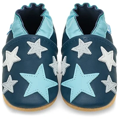 Juicy Bumbles Soft Leather Baby Shoes with Suede Soles Toddler Infant Pre Walker Crib Shoes, 6 12 Months, Blue Stars