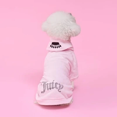 Luxurious Comfort: Pamper your pet with the Juicy Couture Bling Velour Hoodie, featuring soft velour fabric that keeps your furry friend cozy and comfortable during colder months Glamorous Style: Make your pet the star of the show with the exquisite rhinestone detail on the back of this hoodie, adding a touch of sophistication to their outfit Versatile Style: Whether it's a hooded pet jumpsuit for a special occasion or everyday wear, this hoodie is the epitome of versatility, suitable for various pet fashion needs Designer Style: Crafted with the Juicy Couture touch, this pet apparel reflects the brand's commitment to high-quality, fashionable, and cozy pet outfits, perfect for small dogs and cats alike Perfect Gift: Surprise a fellow pet lover with this luxurious Bling Velour Hoodie; it makes for an excellent gift for birthdays, holidays, or special occasions Care Instructions: Hand Wash in cold water don’t bleach, air dry