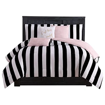 𝗥𝗘𝗩𝗘𝗥𝗦𝗜𝗕𝗟𝗘 𝗦𝗘𝗧: Bring effortless luxury into your bedroom with the Juicy Couture Cabana Stripe Reversible bedding set. This 6-piece set features bold black and white stripes with a distressed pink reversible print on super-soft microfiber that makes this as comfortable as it is stylish. 𝗦𝗘𝗧 𝗜𝗡𝗖𝗟𝗨𝗦𝗜𝗢𝗡: The Cabana comes with three fun decorative pillows that feature gold embroidery and pleats. Queen set includes (1) 90x90 reversible comforter, (2) 20x26 +2 flange pillow shams, (1) 18x18 dec pillow, (1) 12x18 dec pillow, and (1) 16x16 dec pillow (sham inserts sold separately) 𝗖𝗛𝗜𝗖 𝗕𝗘𝗗𝗗𝗜𝗡𝗚 𝗗𝗘𝗦𝗜𝗚𝗡: Transform your bedroom with the laidback glam of Juicy Couture beddings sets. Super-soft microfiber makes this set as comfortable as it is stylish. Decorative throw pillows complete the look with lively contrasting prints, making them the perfect accent for added style and depth 𝗣𝗥𝗘𝗠𝗜𝗨𝗠 & 𝗗𝗨𝗥𝗔𝗕𝗟𝗘 𝗠𝗔𝗧𝗘𝗥𝗜𝗔𝗟𝗦 : Decadently soft and made 100% Microfiber Polyester. Durable and designed to last, The Juicy Couture bed sheets have been tested and inspected to ensure the highest quality assurance and are anti-pilling and wrinkle resistant 𝗖𝗔𝗥𝗘 𝗜𝗡𝗦𝗧𝗥𝗨𝗖𝗧𝗜𝗢𝗡: Machine wash cold, gentle and separately. Do not bleach. Tumble dry low. If there is no free movement in washer or dryer, use large capacity commercial machine. Remove promptly. Do not iron.