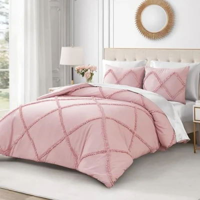JUICY COUTURE Collection: Make a statement with the Juicy Couture Reversible Ruffle Duvet Cover Set. Stylish ruffle detail in diamond pattern with a bold pink on pink design. REVERSIBLE COMFORT SET The Juicy Couture Reversible Ruffle Comforter Set features a pink on pink ruffled diamond pattern. The back features a sumptuously soft plush microfiber. 3 PIECE BED SET The king set includes (1) 108" x 92" comforter and (2) 20" x 36" + 2" flange shams (sham inserts sold separately). Available in Twin, Queen and King sizes. HIGH QUALITY AND DURABLE MATERIALS Decadently soft and made of 100% microfiber polyester. 100% polyester filling. HEAVY DUTY AND LONG LASTING Juicy Couture comforters have been tested and inspected to ensure the highest quality assurance. CARE INSTRUCTIONS Machine washable on gentle cycle and separately. Do not bleach. Tumble dry low. If there is no free movement in the washing machine or dryer, use a commercial washing machine with large capacity. Remove promptly from dryer. Do not iron.