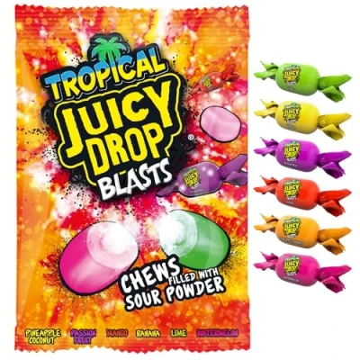 CHEWY SWEETS WITH A TROPICAL SOUR TWIST - Woah! Blast their senses away with these individually wrapped sweets. An innocent fruity outside with a zingy centre that sends a sweet-and-sour jolt to the taste buds 6 EXOTIC FLAVOURS TO DIVE INTO - With a perfect mix of sweet and sour, there's a juicy mouth-watering sensation for every thrill seeker. Includes banana, watermelon, pineapple coconut, passion fruit, mango and lime A HARD-TO-BEAT TREAT - Your go-to stash of chewy sweets to liven up their day. Juicy Drop Blasts are fuel for the sleepover squad, power-ups for the gamers and pick-me-ups for the school runs NO MORE BORING PARTY BAGS - 12 packs bursting to the brim, these tangy birthday sweets in bulk are perfect for parties, pinatas and trick or treaters. Load up Christmas stockings with a blast of fun or build a sweet hamper that blows them away DROP THE ORDINARY - For over 20 years Juicy Drop has put you in control with bold, fruity flavoured sweets and lollipops mixed with a sour twist. Loved by daredevil kids, thrill-seeking teens and only seriously cool parents