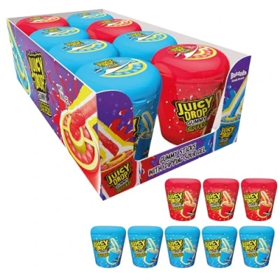 DELICIOUS SWEET STICKS WITH A SOUR DIP - The kids take charge! Each cup is loaded with chewy sweets and a compartment filled with a delicious sour gel, letting kids dip it their way for a perfect mix of sweet and sour TWO DELICIOUS FLAVOURS TO DIVE INTO - Whether you go for strawberry or raspberry, each cup is bursting with juicy, fruity flavour that makes every bite sweet, sour and totally fun A HARD-TO-BEAT TREAT FOR KIDS ON THE GO - Gummy Dipperz come in an adventure-ready resealable tub so kids can dunk, munch and take a break whenever they like. Perfect for road trips, sleepovers and hanging out with mates GET THE PARTY STARTED WITH MULTIPACK SWEETS - 8 tubs of birthday sweets for sharing at parties! Kids can swap sticks and gel to create crazy flavour combos, making parties unforgettable. Also great for Christmas stockings or an epic sweet hamper DROP THE ORDINARY - For over 20 years Juicy Drop has put you in control with bold, fruity flavoured sweets and lollipops mixed with a sour twist. Loved by daredevil kids, thrill-seeking teens and only seriously cool parents