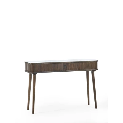 Arya Console Table by Julian Bowen. The Arya Console Table effortlessly combines style and practicality, making it an eye-catching addition to any space. Finished in a luxurious dark oak effect, its sleek, modern design features a slatted sliding tambour door that opens to reveal a spacious storage compartment in the center. Two elegantly crafted cut-out handles add a touch of sophistication, while the four Nordic tapered legs offer sturdy support with a hint of mid-century charm. Whether placed in a hallway or living room, this piece brings timeless elegance and functional storage to elevate your home. Minimal assembly required for an easy and quick setup. Dark oak effect finish adds a touch of luxury. Sliding tambour door reveals hidden storage space. Elegant cut-out handles enhance refined design. Nordic-inspired legs provide solid support. Perfect for hallway or living room décor. Product Details Dimensions: 80.0cm (H) x 120.0cm (W) x 35.0cm (D) Assembly: Full Assembly Required Material: OAK/MDF Finish: Painting Colour: Dark Brown Top Surface Weight Capacity: 100.0kg Cable Management: No Complete the look with coordinating pieces from our sideboards & console tables. Explore more in living room furniture.