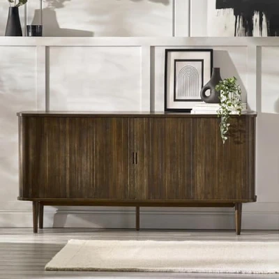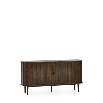 Arya Sideboard by Julian Bowen. Discover the epitome of luxury and functionality with the Arya Sideboard, a statement piece that combines timeless elegance with modern design. Finished in a rich dark oak effect, its slatted sliding tambour doors reveal two push-out drawers and four central shelves, with additional storage in four smaller side shelves. Featuring sleek cut-out handles and four Nordic tapered legs, adding a touch of mid-century charm to any space. Perfect for elevating your living or dining room. Minimal assembly required for quick and effortless setup. Modern design with sophisticated dark oak finish. Four shelves offer versatile storage options. Push-out drawers for easy access to essentials. Slatted tambour doors for sleek, smooth access. Mid-century inspired with Nordic tapered legs. Product Details Dimensions: 80.0cm (H) x 160.0cm (W) x 40.0cm (D) Assembly: Full Assembly Required Material: OAK/MDF Finish: Painting Colour: Dark Brown Top Surface Weight Capacity: 100.0kg Cable Management: No Number of Doors: 2.0 Number of Shelves: 4.0 Number of Drawers: 2.0 Complete the look with coordinating pieces from our sideboards & console tables. Explore more in living room furniture.