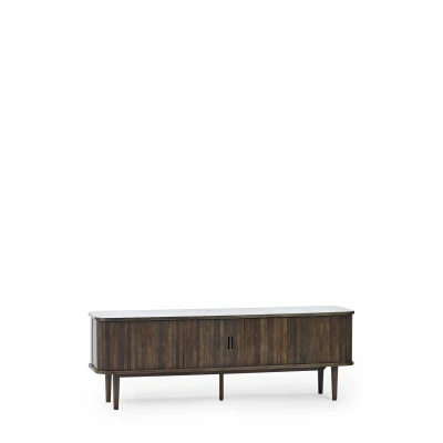 Arya Media Unit by Julian Bowen. Make a statement in your living space with the Arya Media Unit, combining both style and functionality. Crafted in a rich dark oak effect with striking slatted sliding tambour doors. Inside, you'll find ample storage with six shelves and additional smaller side shelves—ideal for organizing CDs, DVDs, game boxes, and displaying decorative pieces. The two cut-out handles and four sleek Nordic tapered legs add a modern touch, elevating the look of any room. Whether you're tidying up or showcasing your favorite items, this versatile piece offers the perfect blend of design and practicality. Simple assembly required to have it functional and ready quickly. Dark oak effect with sleek tambour doors finish Spacious storage with multiple interior shelves. Six internal compartments for efficient storage. Contemporary handles and minimalist wooden legs. Ideal for arranging and showcasing essentials. Product Details Dimensions: 55.0cm (H) x 160.0cm (W) x 40.0cm (D) Assembly: Full Assembly Required Material: OAK/MDF Finish: Painting Colour: Dark Brown Top Surface Weight Capacity: 100.0kg Cable Management: No Complete the look with coordinating pieces from our tv units. Explore more in living room furniture.