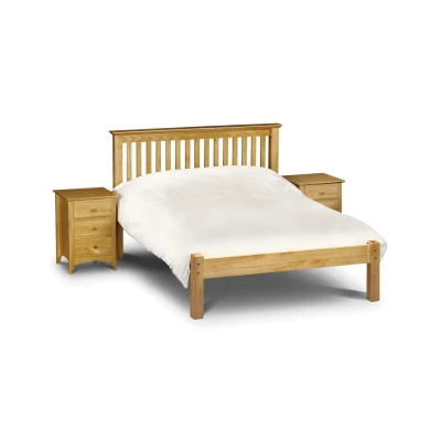 Barcelona Low Footend Bed by Julian Bowen. An imposing bed frame made from solid pine in a timeless shaker style that sits equally well alongside contemporary and traditional interiors. Substantial posts and capping combine with a solid pine slatted base to ensure an incredibly robust and durable bed frame. Timeless shaker design. Substantial posts, capping and solid pine slats ensure a sturdy and durable construction. Available in 90cm, 135cm and 150cm sizes. Low foot end. 12 month product guarantee. Size Guide Size Height (cm) Width (cm) Depth (cm) Headboard Height (cm) Footend Height (cm) Floor Clearance (cm) Slat Type Distance Between Slats (cm) Single 110.0 107.0 209.0 107.0 46.0 30.0 Solid 6.5 Small Double 110.0 137.5 209.0 107.0 46.0 30.0 Solid 6.5 Double 110.0 157.0 209.0 107.0 46.0 30.0 Solid 6.5 King 110.0 168.0 218.0 107.0 46.0 30.0 Solid 6.5 Product Details Material: Solid Pine Colour: Antique Pine Assembly: Full Assembly Required Slat Type: Solid Distance Between Slats: 6.5cm For a restful nightÕs sleep, team Barcelona Low Footend Bed with one of our carefully selected mattresses. As an NBF Retail Champion, Bed Kings only stocks mattresses from trusted, NBF_approved makers, so you can buy with confidence. You can also browse our range of wooden beds.