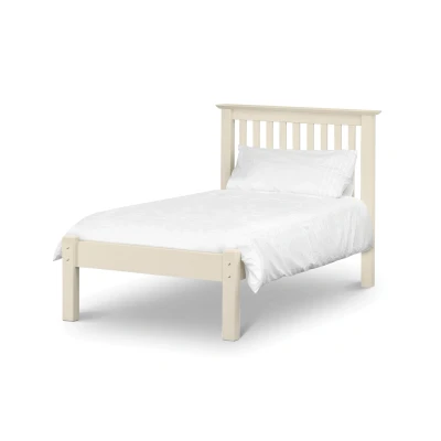 Barcelona Low Footend Bed by Julian Bowen. An imposing bed frame made from solid pine and MDF in an immaculate stone white lacquered finish. Its timeless shaker style sits equally well alongside contemporary and traditional interiors. Substantial posts and capping combine with a solid pine slatted base to ensure an incredibly robust and durable bed frame. Timeless shaker design crafted in high grade solid pine that accompanies perfectly Julian Bowen's classic Cameo bedroom furniture range.. Substantial posts, capping and solid pine slats ensure a sturdy and durable construction. Available in 90cm, 120cm, 135cm and 150cm sizes. Low foot end. 12 month product guarantee. Size Guide Size Height (cm) Width (cm) Depth (cm) Headboard Height (cm) Footend Height (cm) Floor Clearance (cm) Slat Type Distance Between Slats (cm) Single 110.0 107.0 209.0 107.0 46.0 30.0 Solid 6.5 Small Double 110.0 137.5 209.0 107.0 46.0 30.0 Solid 6.5 Double 110.0 157.0 209.0 107.0 46.0 30.0 Solid 6.5 King 110.0 168.0 218.0 107.0 46.0 30.0 Solid 6.5 Product Details Material: Lacquered Pine & MDF Colour: Stone White Assembly: Full Assembly Required Slat Type: Solid Distance Between Slats: 6.5cm For a restful nightÕs sleep, team Barcelona Low Footend Bed with one of our carefully selected mattresses. As an NBF Retail Champion, Bed Kings only stocks mattresses from trusted, NBF_approved makers, so you can buy with confidence. You can also browse our range of wooden beds.