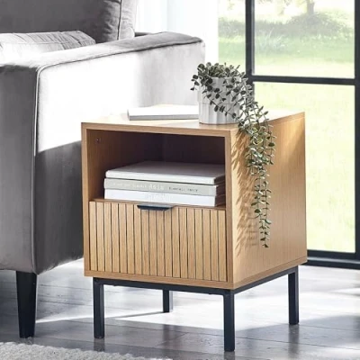 AmazonStylish slatted design adds visual interest. Ideal for compact living and small spaces. Open shelf for displaying books and decor. Convenient drawer for organised storage. Sturdy metal legs for strong support.