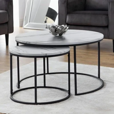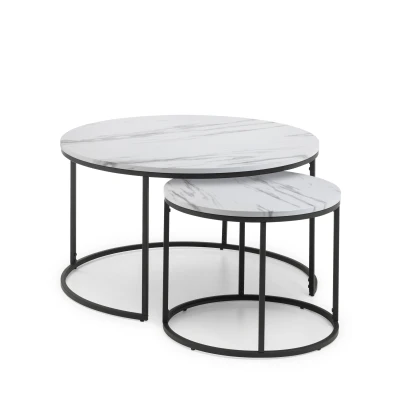Bellini Round Nesting Coffee Table - White Marble by Julian Bowen. The Bellini Round Nesting Coffee Table ensures long lasting durability, crafted from black coated metal and MDF in an white marble foil finish. This set of two coffee tables boast a contemporary, stylish design with an industrial feel. Ensuring a space saving solution, the coffee tables slot together as and when they are in use. Black coated metal frame and white marble foil. Strong and durable construction. Modern design suitable for a range of décor. Offering a space saving solution. 12 month product guarantee. Product Details Dimensions: 45.0cm (H) x 80.0cm (W) x 80.0cm (D) Assembly: Full Assembly Required Material: MDF And Metal Colour: White Marble Complete the look with coordinating pieces from our coffee tables. Explore more in living room furniture.