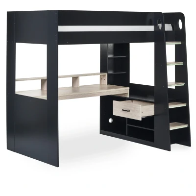 Blaze Gaming Highsleeper - Black And Pale Wood by Julian Bowen. Step into the gaming sanctuary of your dreams with the Blaze Gaming Highsleeper – an exquisite fusion of style and functionality. This expertly crafted bunk bed, with a black and pale woodgrain finish, is beautifully designed to be the ultimate haven for every gamer. Its built-in shelving and drawers seamlessly provide organised storage for gaming gear and essentials within arm's reach. The wide-span desk offers abundant space for any gaming setup, while raised platforms effortlessly cradle monitors, offering an immersive gaming experience. Glow-in-the-dark steps guarantee a secure ascent to the elevated gaming realm. Additionally, the bunk bed is available in a sleek white finish, presenting a diverse range of options to align with your personal style. Ideal for gamers and streamers, the black and pale woodgrain finish seamlessly blends style and functionality to elevate your gaming setup. Built-in shelving and drawers ensure clutter-free access to gaming gear and essentials. Glow-in-the-dark ladder provides a secure and intriguing ascent. Wide-span desk provides abundant space for creating your ideal gaming station with ease. Available in a sleek white finish to suit your personal style. Product Details Dimensions: 178.0cm (H) x 141.1cm (W) x 196.6cm (D) Assembly: Full Assembly Required Material: Wrapped Particleboard, Lvl, Metal Colour: Black And Pale Wood Bed Size: Single Recommended Age: 6+ years (max 14 stone) Slat Type: Solid Distance Between Slats: 6.5cm Desk: H74cm x W154.5cm x D59cm Clearance under desk: 60cm For a restful night’s sleep, team the Blaze Gaming Highsleeper - Black And Pale Wood with one of our carefully selected mattresses. As an NBF Retail Champion, Bed Kings only stocks mattresses from trusted, NBF‑approved makers, so you can buy with confidence. You can also browse our range of wooden beds.