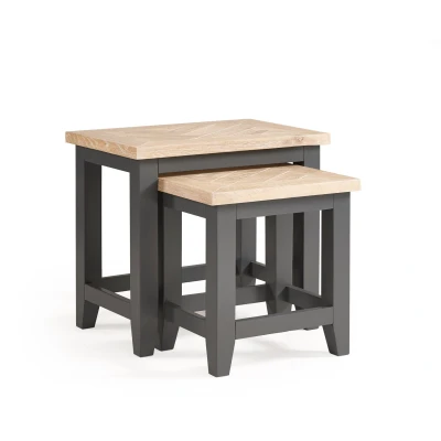 Bordeaux Nest Of Tables Dark Grey by Julian Bowen. Designed exquisitely, the Bordeaux collection is finished in a beautiful grey shade that will complement various existing décor styles. The parquet detailing leaves an elegant and rustic feel – the perfect way to make your house feel like a home. The gorgeous collection includes an extending dining table, dining chair, coffee table, sideboard, lamp table, nest of tables, tv unit, and tall bookcase. Dark Grey Lacquered Finish. Substantial Parquet Top. Classic, timeless design. Part of Julian Bowen's Bordeaux Collection. 12 month product guarantee. Product Details Dimensions: 50.0cm (H) x 56.0cm (W) x 38.0cm (D) Assembly: No Assembly Needed Material: Solid White Oak And Veneers Colour: Dark Grey & Oak Complete the look with coordinating pieces from our dining tables. Explore more in dining room furniture.