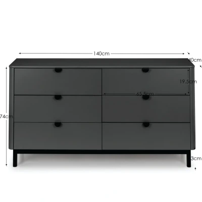 Chloe Storm Grey 6 Drawer Wide Chest by Julian Bowen. The Chloe Bedroom collection has a modern, retro style finished in a storm grey lacquer with satin black wooden legs and handles. The corners are rounded for a softer look, creating perfect balance between style and functionality. Featuring 6 large drawers, this chest is perfect for neatly storing your clothes. Finished in a Storm Grey with satin black wooden legs and handles. Rounded corners for a softer look. Modern, Retro Design. 6 large drawers perfect for storing clothing. 12 month product guarantee. Product Details Dimensions: 74.0cm (H) x 140.0cm (W) x 40.0cm (D) Assembly: Full Assembly Required Material: MDF Colour: Storm Grey/Black Number of Drawers: 6.0 For a restful night’s sleep, team the Chloe Storm Grey 6 Drawer Wide Chest with one of our carefully selected mattresses. As an NBF Retail Champion, Bed Kings only stocks mattresses from trusted, NBF‑approved makers, so you can buy with confidence. You can also browse our range of beds.