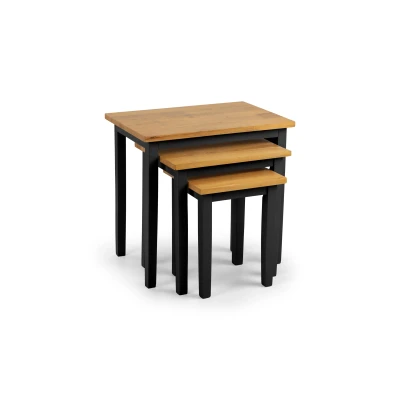Cleo 2 Tone Black and Oak Nest of Tables by Julian Bowen. Bring a bold contrast to your space with this set of three nesting tables, combining sleek black frames with warm oak tops. The striking two-tone design adds a modern touch, while the stacking tables feature keeps things neat and space-efficient. Perfect for use as side or occasional tables, this versatile nest of tables blends style with practicality. Simple to assemble, just attach the leg and enjoy. Striking black and oak two-tone finish. Space-saving design with neat slide-under fit. Versatile nest of tables for flexible use. DIMENSIONS: H 46/39/33 x W 48/37/27 x D 33/29/25cm Included ONE set of 3 tables. Legs attach only. Product Details Dimensions: 45.7cm (H) x 48.0cm (W) x 33.0cm (D) Assembly: Feet only Material: SOLID RUBBERWOOD, METAL Finish: PAINTED Colour: Black and Oak Complete the look with coordinating pieces from our dining tables. Explore more in dining room furniture.