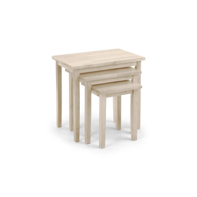 Cleo White Wash Nest of Tables by Julian Bowen. Refresh your space with the light, airy feel of this set of three white wash nesting tables. The soft finish and gently rounded edges bring a relaxed, modern touch to any room. Designed to nest neatly together, the stacking tables help you save space while adding style. Ideal for placing next to a sofa, displaying décor, or holding everyday essentials, this nest of tables offers both function and flexibility. Assembly is simple, just attach the legs and enjoy. Fresh white wash finish brightens spaces. Stacking tables nest neatly to save space. Versatile nest of tables for flexible use. DIMENSIONS: H 46/39/33 x W 48/37/27 x D 33/29/25cm Included ONE set of 3 tables. Legs attach only. Product Details Dimensions: 45.7cm (H) x 48.0cm (W) x 33.0cm (D) Assembly: Feet only Material: SOLID RUBBERWOOD, METAL Finish: PAINTED Colour: White Wash Complete the look with coordinating pieces from our dining tables. Explore more in dining room furniture.