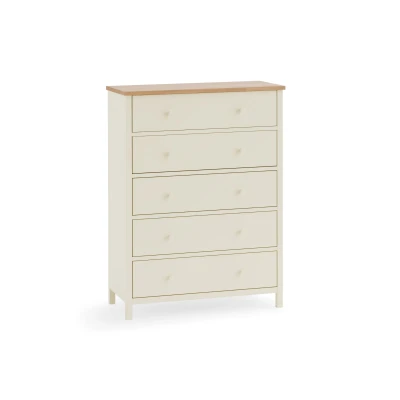 Coxmoor 5 Drawer Wide Chest - Ivory and Oak by Julian Bowen. Upgrade your bedroom storage with the Coxmoor 5-Drawer Wide Chest in an elegant Ivory and Oak finish. Designed with five generously sized drawers, each equipped with sleek knob handles, this chest offers ample space for clothes, bedding, and other essentials. Its horizontal layout maximizes storage while creating a stylish focal point in your room. The blend of Ivory and Oak finish brings a sophisticated touch to your space, effortlessly complementing a variety of décor styles. Built for durability, this chest is a timeless addition to any home, combining both practical storage and elegant design. Requires minimal assembly. Five drawers offer plenty of storage capacity. Wide design adds a striking room centerpiece. Sleek profile blends practicality with style. Perfect for organising bulky items or clothes. Elegant and timeless Ivory and Oak color blend. Product Details Dimensions: 116.0cm (H) x 84.0cm (W) x 40.0cm (D) Assembly: Full Assembly Required Material: Oak/Pine/MDF Finish: Oiled+Painted Colour: Ivory and Oak Number of Drawers: 5.0 For a restful night’s sleep, team the Coxmoor 5 Drawer Wide Chest - Ivory and Oak with one of our carefully selected mattresses. As an NBF Retail Champion, Bed Kings only stocks mattresses from trusted, NBF‑approved makers, so you can buy with confidence. You can also browse our range of beds.