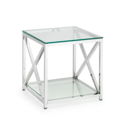 Miami Lamp Table - Silver by Julian Bowen. The lavish Miami occasional collection will add a touch of class and luxury to any home. Taking inspiration from the Art Deco period, the Miami features a striking cross frame design. Crafted from a high quality stainless steel frame and tempered glass, this lamp table provides a shelf underneath for additional storage. Inspiration from the Art Deco Period. Striking cross frame design. Tempered glass top & silver frame. Provides an additional shelf underneath for extra storage. 12 month product guarantee. Product Details Dimensions: 55.0cm (H) x 55.0cm (W) x 55.0cm (D) Assembly: Full Assembly Required Material: Glass & Metal Colour: Glass & Silver Complete the look with coordinating pieces from our lamp tables & side tables. Explore more in living room furniture.