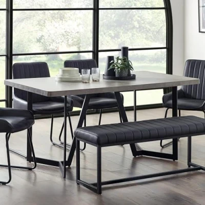 Miller Concrete Effect Dining Table by Julian Bowen. The Miller table has an industrial concrete effect top which makes a great addition to any dining space. The contrasting modern black legs have a beautiful shape - likely to spark conversation when hosting your dinner parties. Not only is this table gorgeous, it is easy-to-clean and hassle free - giving you a perfect aseptic, with minimal effort. Concrete finish leaves a gorgeous industrial look. Contrasting black legs are likely to be a great talking point. Easy to clean top means this table has great aesthetic value whilst being low maintenance. 12 month product guarantee Product Details Dimensions: 76.0cm (H) x 160.0cm (W) x 90.0cm (D) Assembly: Full Assembly Required Material: MDF & Metal Colour: Concrete Effect Seating Capacity: 6.0 Complete the look with coordinating pieces from our dining tables. Explore more in dining room furniture.