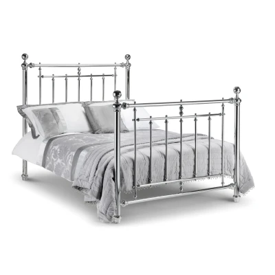 Empress Chrome Bed by Julian Bowen. The Empress is an extremely imposing and impressive chrome bed. Its high headboard and matching footboard create a real wow factor, with the overall effect enhanced by exquisite, highly detailed finials and castings. A sprung slatted base ensures added comfort and prolonged mattress life. A stunning centrepiece for any bedroom. Constructed from chrome plating, the Empress bed is extremely beautiful with a high headboard and matching footboard, enhanced by highly detailed finials and castings creating a wow factor.. Featuring a sprung slatted base for extra comfort, and additional mattress life.. Simple self-assembly required. Available in 135cm and 150cm sizes. 12 month product guarantee. Size Guide Size Height (cm) Width (cm) Depth (cm) Headboard Height (cm) Footend Height (cm) Floor Clearance (cm) Slat Type Distance Between Slats (cm) Double 140.0 145.0 205.0 140.0 116.0 28.0 Solid 6.5 King 140.0 162.0 212.0 140.0 116.0 28.0 Solid 6.5 Product Details Material: Chrome Plated Steel Colour: Chrome Assembly: Full Assembly Required Slat Type: Solid Distance Between Slats: 6.5cm For a restful nightÕs sleep, team Empress Chrome Bed with one of our carefully selected mattresses. As an NBF Retail Champion, Bed Kings only stocks mattresses from trusted, NBF_approved makers, so you can buy with confidence. You can also browse our range of metal beds.