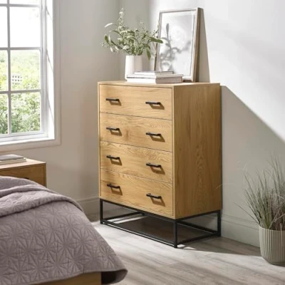 STYLISH AND MINIMALIST DESIGN: Beautifully finished in a light oak effect with natural grain texture, contrasted by a black slim frame and sleek recessed handles for a clean, modern look. SPACIOUS STORAGE: Four roomy drawers provide practical space for clothes, accessories, or home essentials. MULTI-PURPOSE TOP: Wide surface area is ideal for displaying a lamp, mirror, or decor accents. DIMENSIONS: Measuring H 100 x W 80 x D 40cm with a net weight of 35kg. Internal Drawer H 13 x W 72 x D 33cm. External Drawer: H 19 x W 76 x D 35.5cm. Foot/leg: H 18 x W 1.6 x D 1.6cm. Table Top Thickness: 1.5cm. WHAT’S INCLUDED: You will receive ONE 4 drawer chest. Self-assembly required.