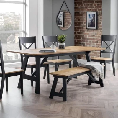 Hockley Table Black/Oak by Julian Bowen. Featuring a 25mm rubberwood top, the Hockley dining table displays the natural colour and unique grain of the wood. A contrasting painted black rubberwood frame allows this dining table to be suitable for a wide range of décor. The perfect match for the Hockley Bench and Hockley Dining Chairs. 25mm solid oak top. Trestle style legs, giving a farmhouse feel. Suitable for a wide range of décor with a natural top and black legs. Part of the Julian Bowen Hockley Dining Collection. 12 month product guarantee. Product Details Dimensions: 74.0cm (H) x 190.0cm (W) x 90.0cm (D) Assembly: Full Assembly Required Material: Rubberwood Colour: Black/Oak Seating Capacity: 6.0 Complete the look with coordinating pieces from our dining tables. Explore more in dining room furniture.