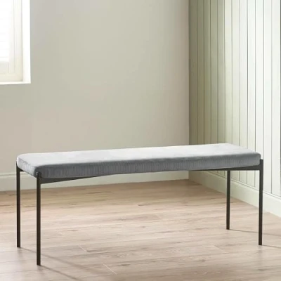 Leonie Bench - Grey by Julian Bowen. Add a touch of refined style to your dining experience with the Leonie Bench in Grey. Upholstered in soft, plush grey velvet, it offers exceptional comfort and sophistication. The padded seat ensures long-lasting comfort, while the slim black coated metal legs create a clean, modern silhouette, providing sturdy support. Minimal assembly is required—simply attach the legs for a seamless setup. Perfect for both formal and casual settings, it brings a chic, understated elegance to your dining space, making it a versatile and stylish choice. Soft grey velvet upholstery adds luxury. Slim black coated metal legs for modern style. Padded seat ensures comfortable seating. Minimal assembly creates a seamless setup. Versatile design fits any dining space. Product Details Dimensions: 47.0cm (H) x 120.0cm (W) x 40.0cm (D) Assembly: Full Assembly Required Material: Fabric, Metal Finish: Power coated Colour: Grey Complete the look with coordinating pieces from our dining sets. Explore more in dining room furniture.