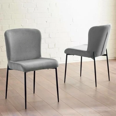 AmazonSoft velvet grey upholstery provides a luxurious and stylish look. Slim black coated metal legs provide a modern and sleek appearance. High backrests and rounded contours ensure comfort and elegance. Armless, minimalist design suits any dining space. Receive two dining chairs featuring grey velvet upholstery and sleek, armless designs for a refined dining experience. Simple assembly required.