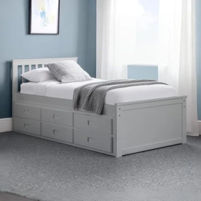 AmazonSpace-Saving Design: Maximize your room’s potential with the Maisie Captains Bed, featuring a pull-out underbed and built-in drawers, perfect for compact living spaces and children’s bedrooms. Sturdy Construction: Crafted from durable MDF and rubberwood, this bed ensures long-lasting reliability and stability, providing a safe and comfortable sleeping environment. Versatile Style: The light grey finish and traditional slatted headboard blend seamlessly with any decor, making it an ideal choice for both modern and classic bedroom settings. Dimensions & Details: Main bed dimensions: L202cm x W102.5cm x H92cm. Underbed dimensions: L194.5cm x W91cm. Drawer depth: 23cm. Provides ample storage and sleeping space. What’s Included: The package includes the complete bed frame with a slatted base, pull-out underbed, and integrated storage drawers. Mattresses are not included.