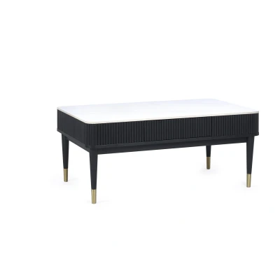 Louis Fluted Stone Top Coffee Table With 2 Drawers - Black by Julian Bowen. Step into luxury with the Louis Fluted Stone Top Coffee Table With 2 Drawers in Black – an enchanting addition to your living space. The captivating white stone marble effect tabletop with a chic matt black ribbed edging exudes timeless sophistication. The tapered legs, featuring elegant gold tips, elevate the table to a new level of style, making it a focal point in any room. This coffee table is designed for both aesthetic appeal and practicality, boasting two push-touch drawers that discreetly offer storage for your essentials. Minimal assembly is required, ensuring a hassle-free setup process. Featuring a captivating white marble effect tabletop. Elevate your living space with chic matt black ribbed edging for timeless sophistication. Tapered legs adorned with elegant gold tips add a touch of luxury. Enjoy practicality with two push-touch drawers discreetly offering storage. Hassle-free setup with minimal assembly required for instant style enhancement. Product Details Dimensions: 47.0cm (H) x 110.0cm (W) x 65.0cm (D) Assembly: Full Assembly Required Material: Ash, MDF, Sintered Stone, Metal Colour: White Marble/Black Complete the look with coordinating pieces from our drawers. Explore more in bedroom furniture.