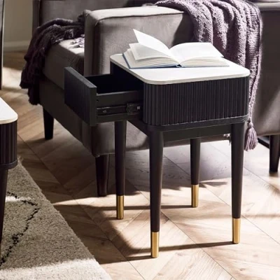 Louis Fluted Stone Top Lamp Table With Drawer - Black by Julian Bowen. Enter a realm of refined elegance with the Louis Fluted Stone Top Lamp Table With Drawers, a harmonious blend of sophistication and practicality. The timeless centerpiece features a white stone marble effect table with matt black ribbed edging. Gorgeous gold-tipped tapered legs add a touch of luxury to the design, while two push-touch drawers discreetly organise your essentials, ensuring a clutter-free living space. Simple assembly ensures you can enjoy this exquisite piece in your home with ease. Features a luxurious white stone marble effect tabletop. Modern matt black ribbed edging adds a contemporary touch. Gold-tipped tapered legs elevate the elegance of your living space. Two push-touch drawers provide discreet organisation for your essentials. Enjoy easy assembly for effortless integration into your home décor. Product Details Dimensions: 56.0cm (H) x 40.0cm (W) x 35.0cm (D) Assembly: Full Assembly Required Material: Ash, MDF, Sintered Stone, Metal Colour: White Marble/Black Complete the look with coordinating pieces from our drawers. Explore more in bedroom furniture.
