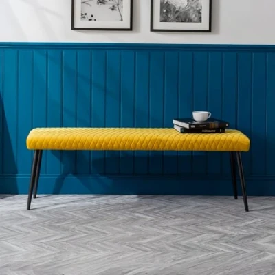 Luxe Low Bench - Mustard by Julian Bowen. Beautifully upholstered in a luxurious velvet fabric finished with a stunning quilted detail, the Luxe Low Bench is available in Mustard, Blue, or Grey. Perfect for a striking hallway bench, or a statement dining area, with matching Luxe Chairs available. Classic Style with a modern twist. Upholstered in luxurious mustard velvet fabric with quilted detailing. Contemporary black painted legs. Perfect for any dining area or a striking focal point for any room. 12 month product guarantee. Product Details Dimensions: 47.0cm (H) x 140.0cm (W) x 37.0cm (D) Assembly: Full Assembly Required Material: Velvet/Metal Colour: Mustard/Black Complete the look with coordinating pieces from our dining sets. Explore more in dining room furniture.