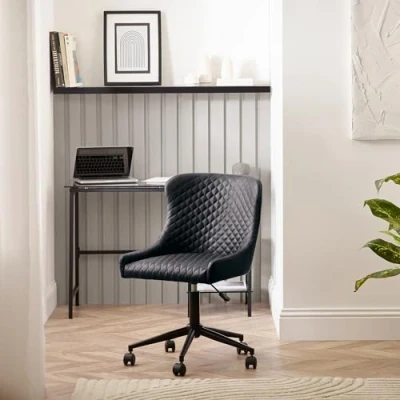 Luxe Office Chair In Black Faux Leather by Julian Bowen. Step into the world of sophistication and comfort with the Luxe Office Chair in Black Faux Leather. This chair effortlessly combines elegance with contemporary flair, boasting exquisite faux leather upholstery adorned with opulent quilted detailing. Complete with five sleek black coasters for effortless mobility and a height-adjustable mechanism for customisable comfort, it caters to your individual preferences while enhancing your overall comfort and productivity. Minimal assembly is required, ensuring a hassle-free setup. Luxuriate in opulent faux leather upholstery with intricate quilted detailing. Glide seamlessly with five sleek coasters for effortless mobility. Customise your comfort with a height-adjustable mechanism tailored to your preferences. Revel in contemporary flair, marrying elegance with functionality. Enhance productivity and style in your workspace with minimal assembly required. Product Details Dimensions: 97.0cm (H) x 52.0cm (W) x 60.0cm (D) Assembly: Full Assembly Required Material: Velvet, Foam, Metal Colour: Black Complete the look with coordinating pieces from our office chairs. Explore more in home office.
