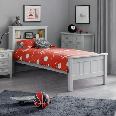 Maine Bookcase Bed by Julian Bowen. The Maine Bookcase Bed features a high headboard with a shelf, perfect for storing books at arms reach for your evening read! Crafted from MDF with an exquisite dove grey lacquer, this bed features New England style panelling on the headboard creating a timeless appeal. A solid slatted base ensures supreme comfort and prolonged mattress life. The perfect match for the Maine Underbed, creating a space saving solution perfect for sleepovers! Finished in an exquisite dove grey lacquer. Strong and durable construction. Featuring a shelf within the headboard perfect for storing books. Part of the Julian Bowen Maine Bedroom range. Showing its characteristic with New England style panelling, creating a timeless appeal. Size Guide Size Height (cm) Width (cm) Depth (cm) Headboard Height (cm) Footend Height (cm) Floor Clearance (cm) Slat Type Distance Between Slats (cm) Single 114.0 104.0 214.0 112.6 62.5 19.0 Solid 6.5 Product Details Material: MDF Colour: Dove Grey Assembly: Full Assembly Required Slat Type: Solid Distance Between Slats: 6.5cm For a restful nightÕs sleep, team Maine Bookcase Bed with one of our carefully selected mattresses. As an NBF Retail Champion, Bed Kings only stocks mattresses from trusted, NBF_approved makers, so you can buy with confidence. You can also browse our range of beds.