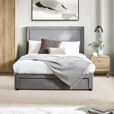Mayfair 4 Drawer Storage Bed by Julian Bowen. Indulge in luxurious style and functionality with this 135cm grey 4 drawer bed. Beautifully crafted with a sleek grey upholstered frame, it features a refined headboard outline that adds a sophisticated touch to your bedroom. The plush, padded headboard ensures ultimate comfort, while the four spacious under-bed drawers offer discreet storage to keep your space organised. Blending modern elegance with practical convenience, it effortlessly enhances your room. With minimal assembly required, you can effortlessly transform your space into a lavish retreat. Mattress sold separately. Modern grey frame with soft, padded headboard. Elegant headboard adds refinement and comfort. Spacious under-bed drawers for hidden storage. Modern design perfect for any bedroom styles. Easy assembly for quick setup in your space. Size Guide Size Height (cm) Width (cm) Depth (cm) Headboard Height (cm) Footend Height (cm) Floor Clearance (cm) Slat Type Distance Between Slats (cm) Max Weight Limit (kg) Leg Height (cm) Leg Width (cm) Leg Depth (cm) Underbed/Ottoman Storage (H _ W _ D) Double 127.0 145.0 209.0 127.0 31.0 4.0 Sprung 6.5 250.0 4.0 7.5 4.0 14.5cm (H) x 54.0cm (W) x 58.0cm (D) King 127.0 160.0 217.0 127.0 31.0 4.0 Sprung 6.5 150.0 4.0 7.5 4.0 14.5cm (H) x 54.0cm (W) x 58.0cm (D) Super King 127.0 189.0 217.0 127.0 31.0 4.0 Sprung 6.5 150.0 4.0 7.5 4.0 14.5cm (H) x 54.0cm (W) x 58.0cm (D) Product Details Material: Metal Frame + FOAM + Fabric Finish: UPHOLSTREY Colour: Grey Assembly: Full Assembly Required Slat Type: Sprung Distance Between Slats: 6.5cm Recommended Age: Does Not Apply+ years For a restful nightÕs sleep, team Mayfair 4 Drawer Storage Bed with one of our carefully selected mattresses. As an NBF Retail Champion, Bed Kings only stocks mattresses from trusted, NBF_approved makers, so you can buy with confidence. You can also browse our range of fabric upholstered beds.