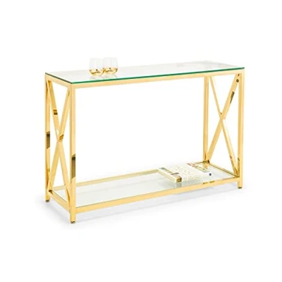 AmazonElegant Design: Gold-finished frame with crisscross accents adds sophistication to any room, blending Art Deco inspiration with modern elegance for a timeless look. Durable Construction: Crafted from high-quality stainless steel and tempered glass, ensuring long-lasting stability and support, making it a reliable addition to your home decor. Versatile Functionality: Features a spacious glass top and lower shelf for ample storage and display space, perfect for hallways, living rooms, or entryways. Dimensions & Details: Measures 120 cm in length, 40 cm in width, and 78 cm in height, providing ample surface area and fitting perfectly in any room. What’s Included: Console table with glass top and lower shelf; minimal assembly required – just add feet for instant elegance and organization.