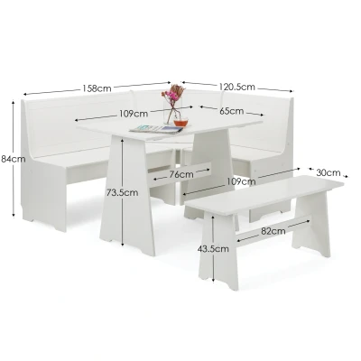 Newport Corner Dining Set With Storage Bench - Surf White by Julian Bowen. This classic corner design is perfect for any traditional or rustic home. Finished in a fresh surf white lacquer, the Newport corner dining set features high seatbacks and a bench with a classic, eye-catching design. This dining set is perfect for any kitchen or dining room with a small area. Fresh Surf White Lacquered Finish. High seatbacks and a bench. Perfect for small dining or kitchen areas with a traditional décor. Measurements: H x D x W Corner Nook - 85.4 x 120.4 x 158 Table - 73.7 x 65 x 109 Bench - 43.7 x 30 x 109. 12 month product guarantee. Product Details Dimensions: 85.4cm (H) x 158.0cm (W) x 120.0cm (D) Assembly: Full Assembly Required Material: MDF & Wood Colour: Surf White Complete the look with coordinating pieces from our dining tables. Explore more in dining room furniture.