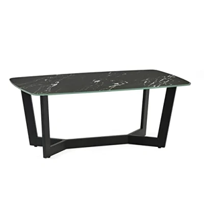 Olympus Coffee Table - Black Marble by Julian Bowen. Inspired by beautiful Italian marble, the Olympus collection delivers character and glamour to your space. With statement, contrasting black bases – this look is destined for any contemporary home. The collection includes a dining table, lamp table and coffee table in either option of white or black marble. Innovative marble effect printed on glass Sturdy metal base. Available in black or white marble effect. Range includes Dining, Coffee and Lamp Tables. 12 month product guarantee Product Details Dimensions: 40.0cm (H) x 110.0cm (W) x 60.0cm (D) Assembly: No Assembly Needed Material: Glass & Metal Colour: Black Marble Effect Complete the look with coordinating pieces from our coffee tables. Explore more in living room furniture.