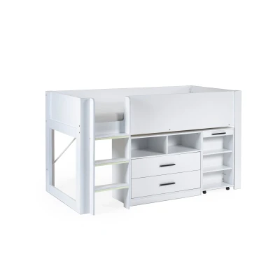 Otis Midsleeper - All White by Julian Bowen. Embark on a bedtime adventure with the Otis Midsleeper a versatile and stylish addition to your child's room that transforms bedtime into an adventure. The crisp all-white finish sets a clean and modern tone. Featuring two pull-out drawers with handles for convenient storage and shelving underneath for toys and essentials. The highlight of this bed is the pull-out desk with wheels, offering a dedicated study space that can be easily tucked away when not in use. Additional shelving space ensures an organised and clutter-free environment for your little one. The three glow-in-the-dark steps add charm and safety, creating a playful and secure ascent to the cosy sleeping area. Transform your child's room into an exciting bedtime adventure with its versatile design. Finished in a crisp all white for a clean and modern tone, enhancing the room's aesthetics. Features pull-out drawers with handles for convenient storage, while shelving underneath allows for organized placement of toys and essentials. The pull-out desk with wheels offers a dedicated study space, maximizing space in the room. Three glow-in-the-dark steps add charm and secure ascent to the cozy sleeping area. Product Details Dimensions: 112.3cm (H) x 106.099999999999cm (W) x 199.5cm (D) Assembly: Full Assembly Required Material: Wrapped Particleboard, Lvl, Metal Colour: White Bed Size: Single Recommended Age: 6++ years Slat Type: Solid Distance Between Slats: 6.5cm For a restful night’s sleep, team the Otis Midsleeper - All White with one of our carefully selected mattresses. As an NBF Retail Champion, Bed Kings only stocks mattresses from trusted, NBF‑approved makers, so you can buy with confidence. You can also browse our range of kids beds, bunk beds & gaming beds.