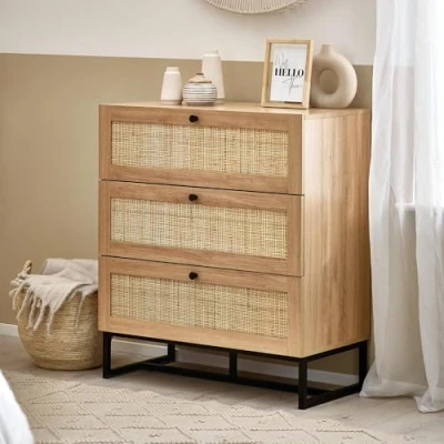 AmazonStylish Oak Finish: Crafted with a beautiful oak finish, this chest of drawers adds a touch of elegance to any bedroom decor. The natural rattan fronts enhance its aesthetic appeal, making it a standout piece. Ample Storage Space: Featuring three spacious drawers, this chest provides ample storage for clothes, accessories, and other essentials. The soft-close mechanism ensures quiet and smooth operation, perfect for maintaining a serene environment. Durable and Sturdy Construction: Built with high-quality oak wood and a robust metal frame, this chest is designed for long-lasting durability. The industrial-style base adds stability and a modern touch to your room. Dimensions & Details: The chest measures 90 cm in height, 80 cm in width, and 40 cm in depth. The compact design makes it ideal for smaller spaces while still offering plenty of storage. What’s Included: The package includes the chest of drawers, delivered in one box for easy assembly. Instructions and necessary hardware are included, ensuring a hassle-free setup.