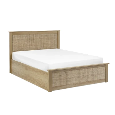 Padstow Ottoman Bed by Julian Bowen. Transform your bedroom into a stylish retreat with the Padstow Ottoman Bed in Oak. This beautifully crafted bed brings a touch of sophistication with its minimalist design and contemporary flair. The oak finish adds warmth and charm to any space, creating a relaxing atmosphere. What sets the Padstow Ottoman bed apart is its practical storage featureÑsimply lift the frame to reveal a spacious compartment perfect for storing linens, blankets, or other bedroom essentials. Mattress sold separately. Stylish rattan headboard and footboard complement the contemporary minimalist aesthetic. Warm oak finish brings a cosy and inviting ambiance Lift-up design for easy access to the hidden storage area Provides ample room for storing bedding and other essentials. A perfect combination of style and functionality to upgrade your bedroom. Size Guide Size Height (cm) Width (cm) Depth (cm) Headboard Height (cm) Footend Height (cm) Slat Type Distance Between Slats (cm) Double 106.0 150.5 206.0 100.0 36.0 Sprung 6.5 King 106.0 165.0 216.0 100.0 36.0 Sprung 6.5 Product Details Material: MDF, Pvc & Natural Rattan, Pine,Lvl, Metal Colour: Oak Assembly: Full Assembly Required Slat Type: Sprung Distance Between Slats: 6.5cm For a restful nightÕs sleep, team Padstow Ottoman Bed with one of our carefully selected mattresses. As an NBF Retail Champion, Bed Kings only stocks mattresses from trusted, NBF_approved makers, so you can buy with confidence. You can also browse our range of wooden beds.