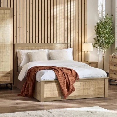Padstow Ottoman Bed by Julian Bowen. Transform your bedroom into a stylish retreat with the Padstow Ottoman Bed in Oak. This beautifully crafted bed brings a touch of sophistication with its minimalist design and contemporary flair. The oak finish adds warmth and charm to any space, creating a relaxing atmosphere. What sets the Padstow Ottoman bed apart is its practical storage featureÑsimply lift the frame to reveal a spacious compartment perfect for storing linens, blankets, or other bedroom essentials. Mattress sold separately. Stylish rattan headboard and footboard complement the contemporary minimalist aesthetic. Warm oak finish brings a cosy and inviting ambiance Lift-up design for easy access to the hidden storage area Provides ample room for storing bedding and other essentials. A perfect combination of style and functionality to upgrade your bedroom. Size Guide Size Height (cm) Width (cm) Depth (cm) Headboard Height (cm) Footend Height (cm) Slat Type Distance Between Slats (cm) Double 106.0 150.5 206.0 100.0 36.0 Sprung 6.5 King 106.0 165.0 216.0 100.0 36.0 Sprung 6.5 Product Details Material: MDF, Pvc & Natural Rattan, Pine,Lvl, Metal Colour: Oak Assembly: Full Assembly Required Slat Type: Sprung Distance Between Slats: 6.5cm For a restful nightÕs sleep, team Padstow Ottoman Bed with one of our carefully selected mattresses. As an NBF Retail Champion, Bed Kings only stocks mattresses from trusted, NBF_approved makers, so you can buy with confidence. You can also browse our range of wooden beds.