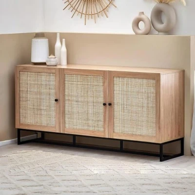 Padstow Sideboard - Oak by Julian Bowen. Fusing modern construction with retro design elements, the Padstow collection will exquisitely complement any styled home. The natural rattan fronts and industrial-style base collaborate perfectly to leave a warm yet chic aesthetic in your home. This range includes a bedside, 3 drawer chest, 6 drawer chest, wardrobe, coffee table, TV unit, sideboard, and tall bookcase. Also available in a black finish. Natural rattan fronts. Industrial style base. Available in Oak or Black. Part of the Padstow Bedroom Collection. 12 month product guarantee. Product Details Dimensions: 75.0cm (H) x 160.0cm (W) x 40.0cm (D) Assembly: Full Assembly Required Material: Melamine With Rattan Front & Metal Base Colour: Oak Cable Management: No Number of Doors: 3.0 Number of Shelves: 2.0 Complete the look with coordinating pieces from our sideboards & console tables. Explore more in living room furniture.