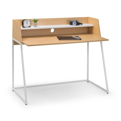 Palmer Desk by Julian Bowen. The Palmer Desk offers a simplistic, functional design. Offering a large surface area for your laptop and paperwork, along with an additional shelf for your stationary. This desk offers a space for your wires to sit neatly down the back of the desk, allowing you to keep your workspace tidy. Finished in an oak effect with a contrasting white shelf and legs, this desk suitable for a wide range of décor. Large surface area. Shelf perfect for stationary. A cable hole is available at the back of the desk. Finished in an oak effect with a contrasting white shelf and legs. 12 month product guarantee. Product Details Dimensions: 89.0cm (H) x 120.0cm (W) x 62.0cm (D) Assembly: Full Assembly Required Material: Melamine & Metal Colour: White/Oak Cable Management: Yes Complete the look with coordinating pieces from our desks. Explore more in home office.
