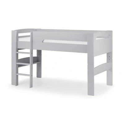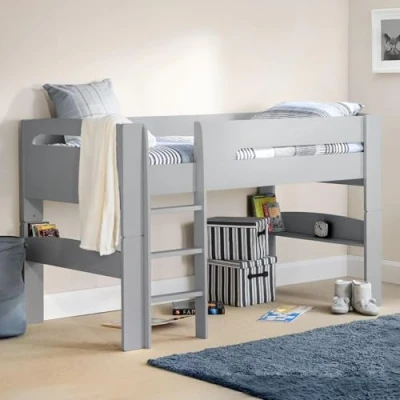 Pluto Midsleeper - Dove Grey The Pluto Midsleeper is a sturdy and stylish mid-sleeper finished in a smooth dove grey lacquer. Pluto's contemporary design is accompanied by great functionality, with a robust ladder that can be assembled on either left or right and the capacity to convert to a single bed if required at any time in the future. It can be used on its own or paired with the extensive Julian Bowen Maine Bedroom collection, while pairing it with the Pluto Star Tent Ê(sold separately) in either pink or blue will turn the Pluto mid-sleeper into a fun and vibrant play space for kids to enjoy Features : Sturdy and Stylish smooth dove grey lacquer finish : A Robust ladder that can be assembled left or right of the bed. : The capacity to convert to a single bed if required in the future. : Accepts UK Standard Size Single Mattresses. : 12 month product guarantee Specifications: Colour: Grey Height: 121 Width ( SIDE TO SIDE): 104 Depth (HEAD TO TOE): 196 Assembled Product Weight: 59 Gross Weight: 63 Weight Limit : 12 Assembly Required: Yes Fixings Included: Yes Mattress Included: NO Maximum Mattress Height: 16cm Mattress Compatibility: Standard UK single 90 x 190 ( check mattress depth) Distance Between Bunks: NA Top of side rail to floor : 96 Material: Laquered Solid Pine & MDF Bottom of side rail to floor : 80 Distance from floor to top of ladder: 80.5 Minimum Age: 6 Safety Notes: minimum gap of at least 300mm where not situated next to a solid wall