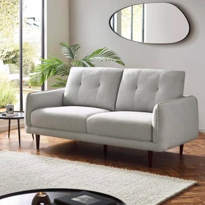 AmazonMID-CENTURY INSPIRED: Clean lines, tufted back cushions, and tapered wooden legs create a stylish retro-modern silhouette. SPACE-SAVING COMFORT: Compact footprint ideal for apartments, reading corners, or as a secondary sofa. TEXTURED FABRIC: Upholstered in a soft light grey woven fabric that is both comfortable and durable. DIMENSIONS: Measuring W 92 x D 86 x H 186 cm with a net weight of 42kg. WHAT’S INCLUDED: You will receive ONE three-seater sofa. Assembly required - legs need attaching.