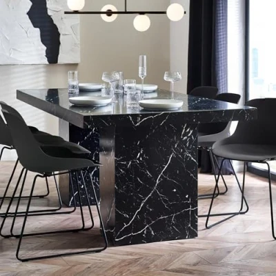 AmazonShowcases a stunning black marble effect tabletop, effortlessly merging classic sophistication with a modern twist. The inclusion of sleek pedestal legs adds a touch of contemporary flair, elevating the overall design and ensuring a stylish dining experience. The expansive tabletop instantly captivates, serving as a striking centerpiece for gatherings and meals. Luxurious refinement is offered through a realistic marble effect pattern, introducing opulence to your dining space. H 76 x W 180 x D 100cm