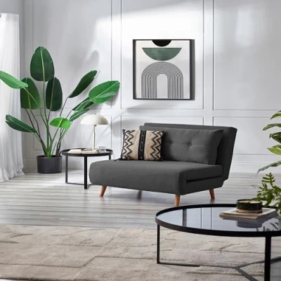 AmazonStylish mid-grey fabric upholstery complements the wooden-effect legs for a chic, modern look. The button-tufted matching pillow adds extra comfort while enhancing the overall aesthetic. Easily transforms into a single bed, making it perfect for guest rooms or living areas. Dimensions: Width 192cm x Depth 102cm x Height 82cm - Net Weight: 26.5 kg Simple assembly required. You will receive the sofabed with parts and instructions for quick assembly.